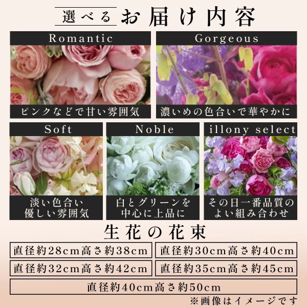 花束はお花の雰囲気を選んで頂けるようになっておりますので是非ご利用ください。